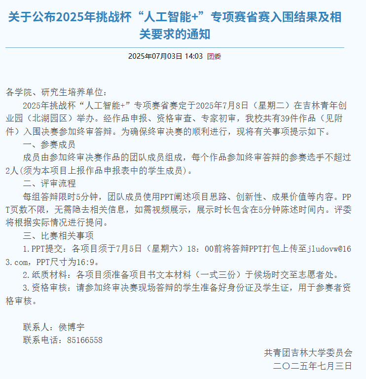 关于公布2025年挑战杯“人工智能+”专项赛省赛入围结果及相关要求的通知